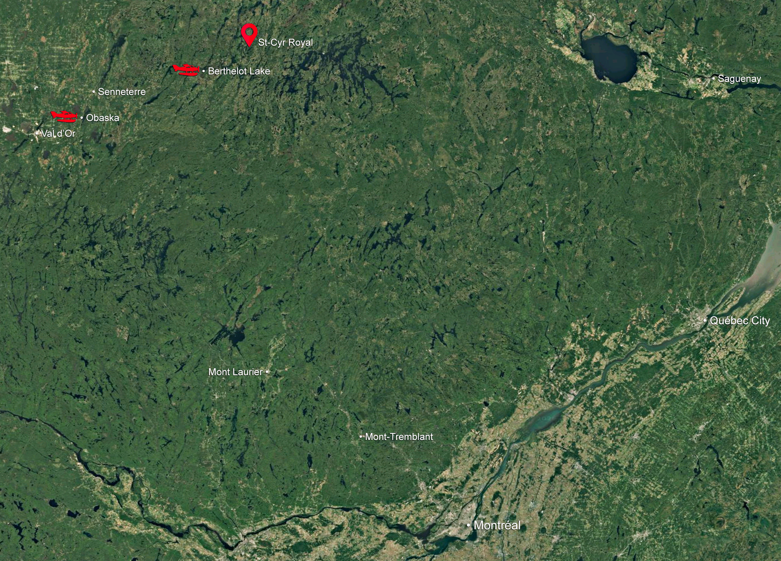 Pickup at Camping Doré on Route 113 with secure parking. Just a 45-minute flight to St-Cyr Royal, ideal for guests arriving by commercial flight to Val-d’Or with a short taxi transfer.